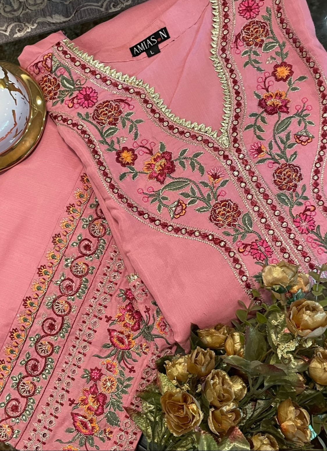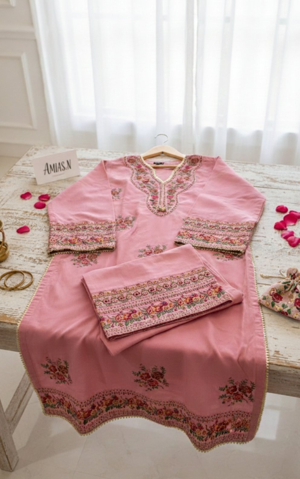 Elevate your everyday elegance with this beautifully crafted Raw silk ready-to-wear suit in a soft pink tone. Designed with delicate floral embroidery across the neckline, sleeves, and hem, this outfit reflects timeless Eastern charm with a modern touch.