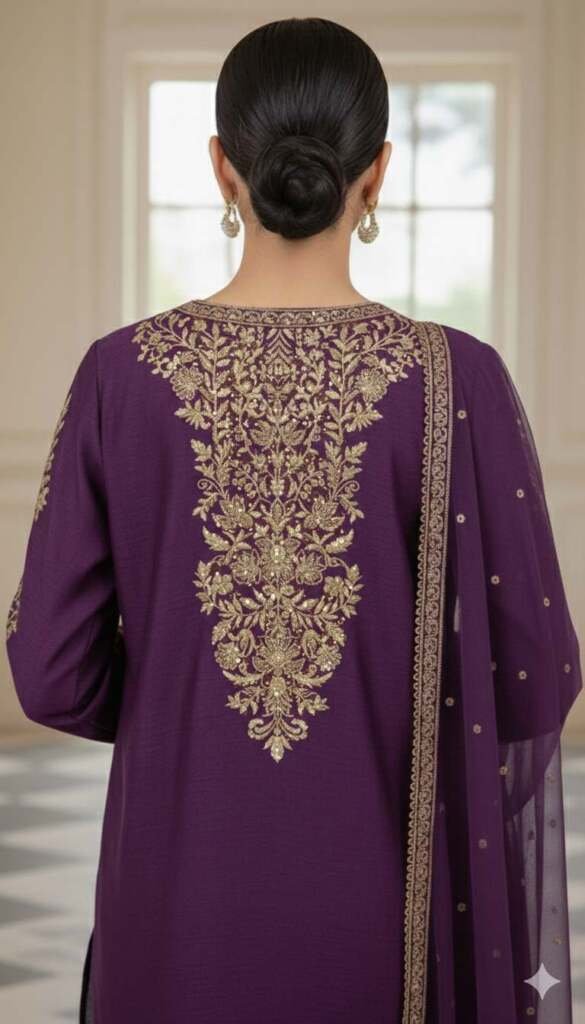 This sophisticated three-piece suit is crafted in a rich, jewel-toned plum fabric that offers a luxurious sheen. The Kameez (tunic) serves as the centerpiece, adorned with meticulous antique gold embroidery with sequin that flows from a split-neckline into a dense, regal medallion at the hem. The symmetrical floral motifs on the bodice are framed by vertical embroidered borders, creating a lengthening silhouette that is both flattering and formal.
