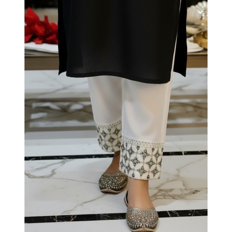 Embroidered Pearl White Trouser